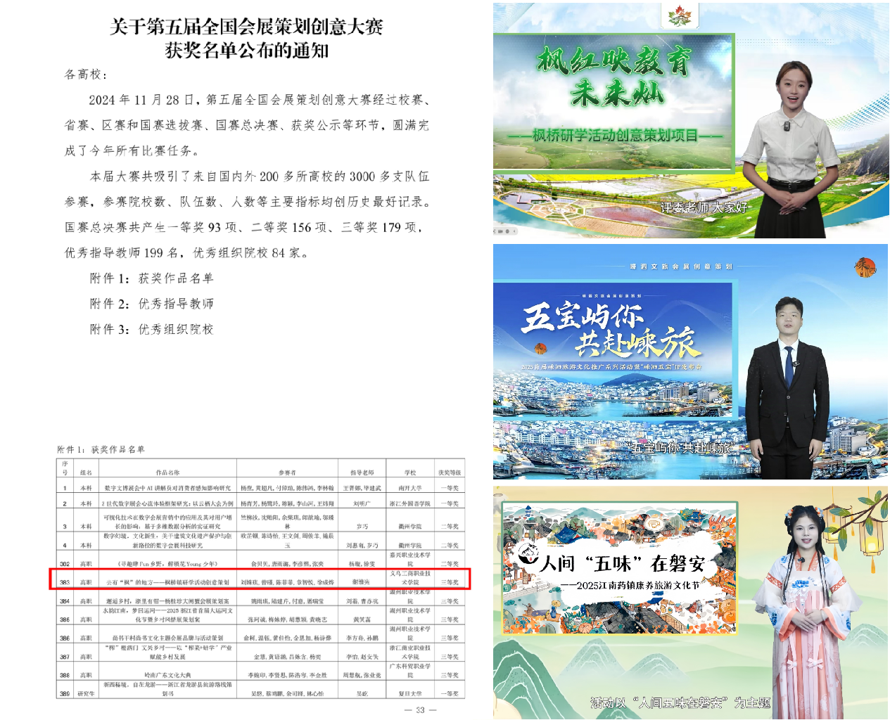 近日,全国会展策划创意大赛和浙江省第十四届会展策划创意大赛相继落下帷幕。大赛由全国会展策划创意大赛竞赛委员会、上海大学、浙江外国语学院、国际会展学会主办,中央文化和旅游管理干部学院支持,上海会展研究院等八家单位承办,包含会展创意赛道、会展设计赛道、”跟着短视频去旅行“赛道、AIGC公益赛道等九大赛道,经过省初赛、决赛、国赛的激烈角逐,uedbet,uedbet体育人文旅游学院学生在比赛中崭露头角,荣获国家三等奖1项,省二等奖1项、三等奖2项,实现了会展专业国家级竞赛“零的突破”。