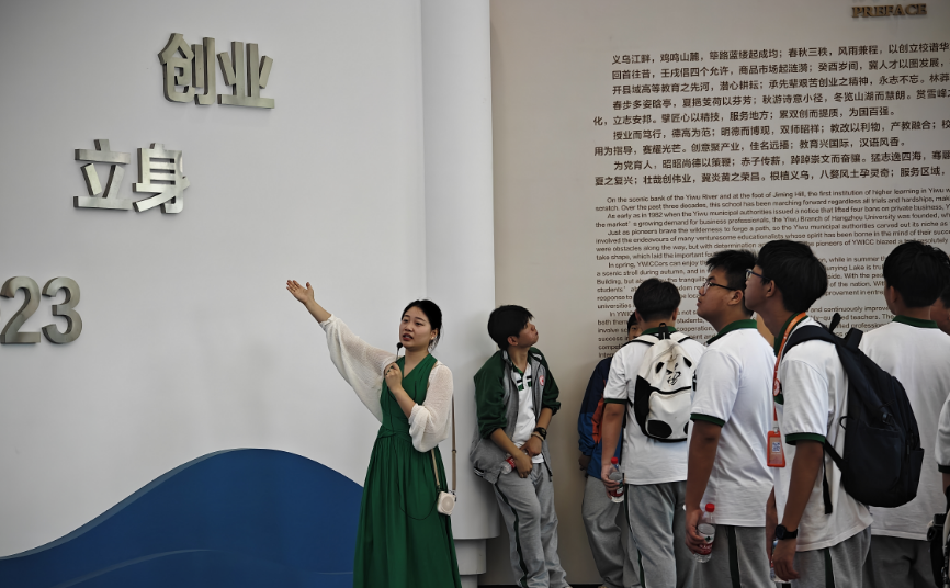 随后,在学生志愿者的引导下,大家漫步校园主干道,参观了特色建筑区域,亲身感受了学院优美的学习环境和浓厚的文化氛围。此次研学的重要一站是学院的湖边校史馆。通过丰富的图片、实物和多媒体展示,师生们系统了解了义乌工商职业技术学院的建校历史、发展历程、办学成就以及深厚的文化底蕴,进一步加深了对学校的认同感和归属感。