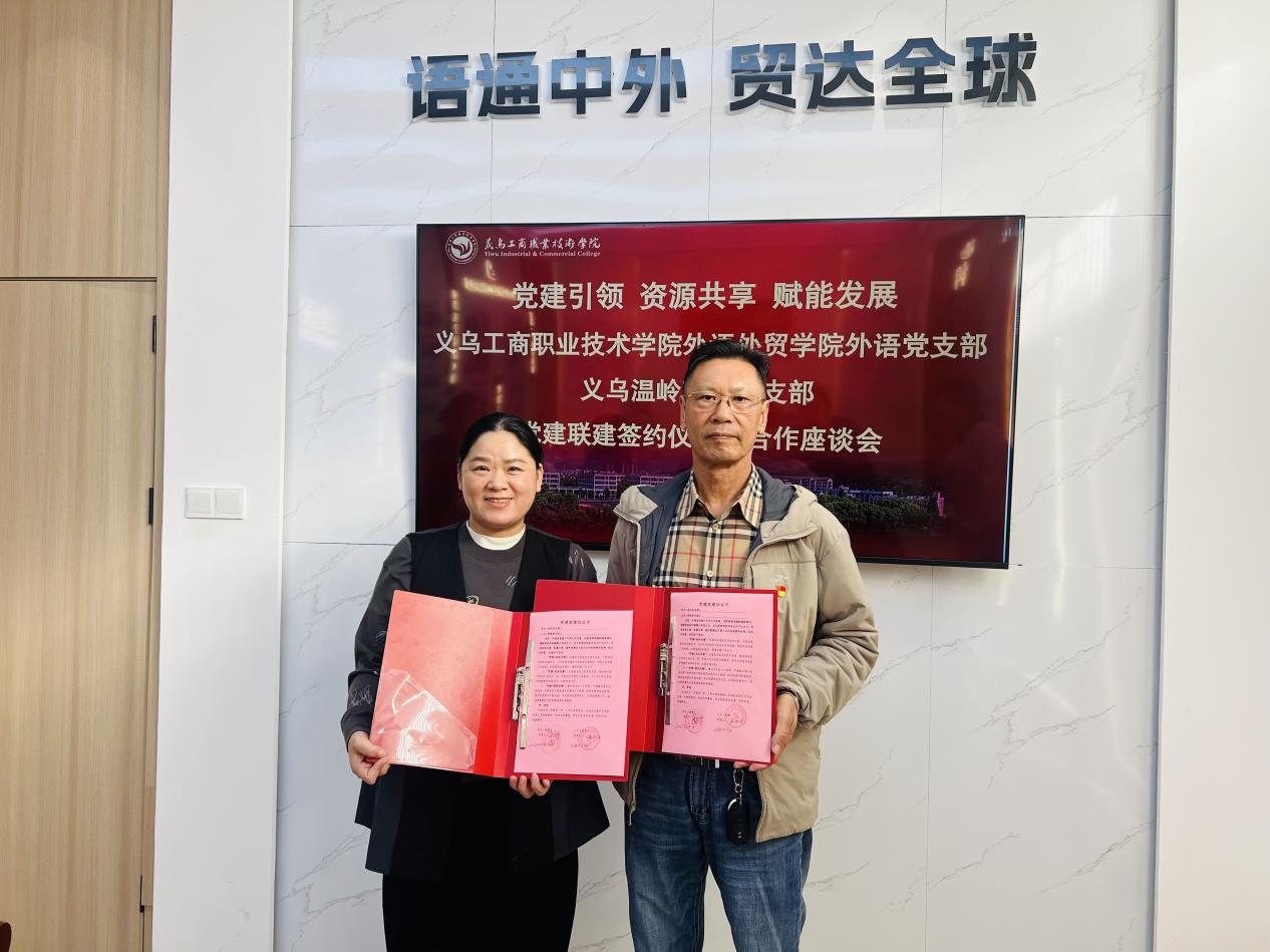 为创新党建工作模式,深化产教融合,近日,义乌工商职业技术学院外语外贸学院外语党支部与义乌温岭商会党支部成功举行党建联建签约仪式。双方旨在通过党建统领,实现资源共享与优势互补,共同开启校地合作新篇章。