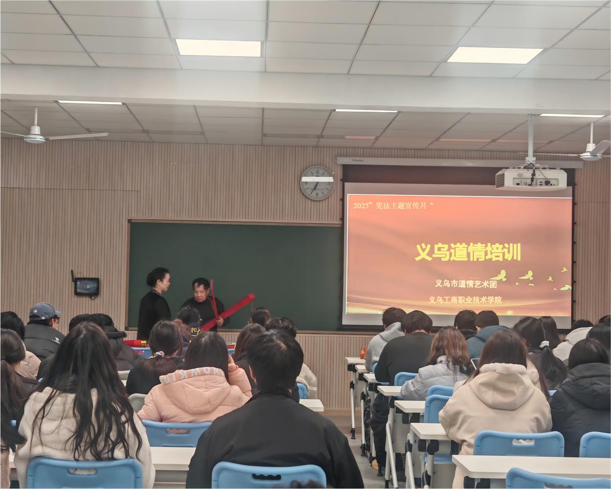 “渔鼓声声传法治,道情悠悠润人心;丝路学子同研习,宪法精神共传承……”富有节奏的渔鼓声中,夹杂着略带生涩却充满热情的唱腔,从义乌工商职业技术学院的教室内飘出。这并非普通的音乐课,而是一场别开生面的非遗文化与法治融合课——2025年“宪法主题宣传月”期间,义乌工商职业技术学院联合义乌市道情艺术团,将国家级非物质文化遗产“义乌道情”培训引入校园,来自世界各地的留学生与中国学生手持渔鼓、简板,以古老民间艺术为载体,传唱宪法精神,让法治之音在丝路学子心中扎根。