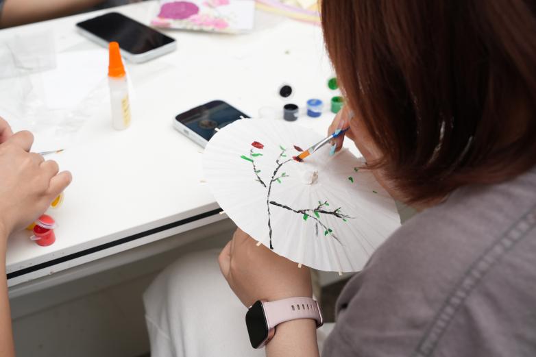 活动现场,同学们以油纸伞为载体,挥毫绘就春日盛景与清明寄思。或描摹踏青野趣,或题写诗意佳句,每一把伞都承载着独特的审美与思念,成为流动的艺术。