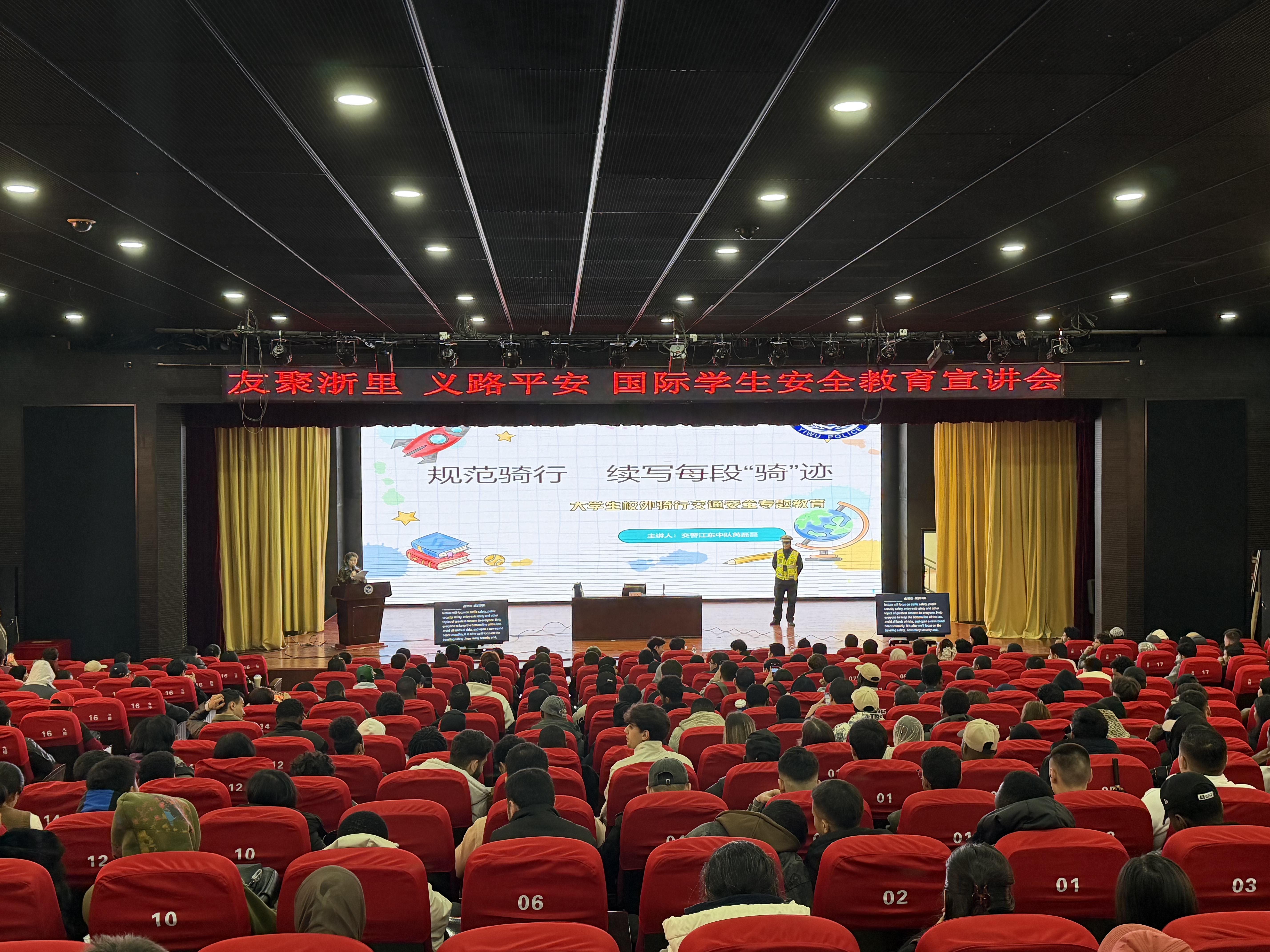 4月1日上午,国际教育学院联合学校安全保卫部,在丹溪文化厅举办“友聚浙里 义路平安”国际学生安全教育宣讲会。本次活动特邀义乌市公安局交警大队江东中队、江东派出所、出入境管理局民警现场授课,全体国际学生参加。
