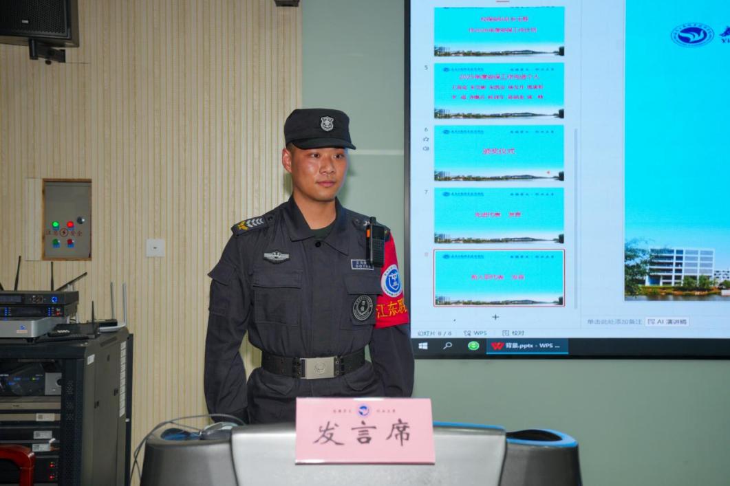 义乌市保安服务有限公司物业部经理对2025年度校园安保工作进行全面回顾总结,客观梳理工作成效、深入分析存在的不足;校保安队长围绕队伍管理、日常执勤、应急处置、技防运维等重点方面,对2026年重点工作作出详细安排。先进代表王赛克结合自身岗位实际,分享了履职工作经验与心得体会。新入职队员代表华强作表态发言,表达了立足岗位、恪尽职守、服务师生的坚定决心。