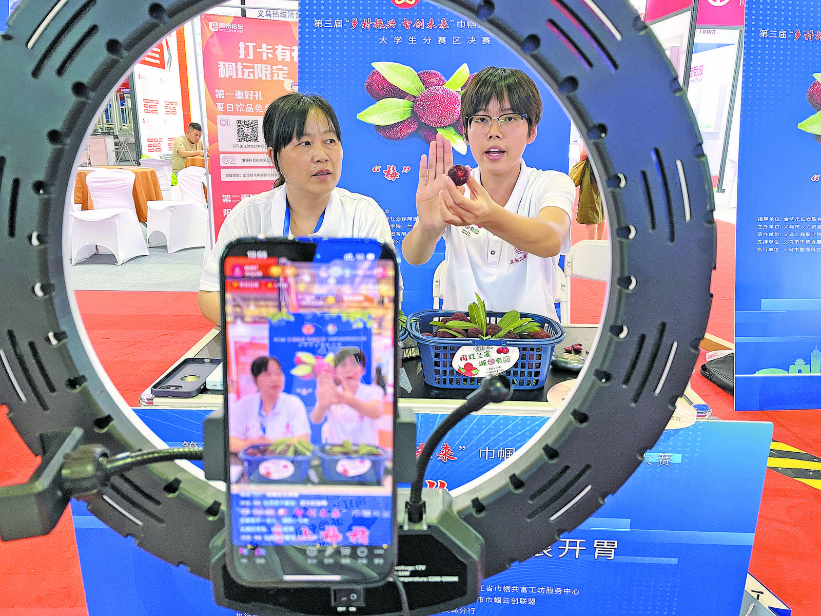 “不是所有的杨梅都叫香溪杨梅,粒粒饱满、颗颗香醇的果中精品,您品尝过一定会念念不忘,心动的朋友们赶紧下单吧……”昨日,第三届“乡村振兴 智创未来”巾帼共富创新创业大赛大学生分赛区决赛在国际博览中心D2区举行,大学生主播们卖力“吆喝”香溪的杨梅。