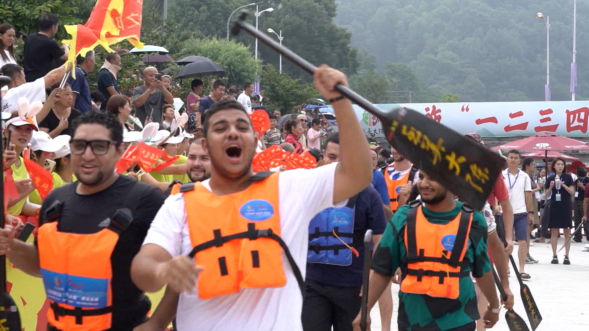 “棹影斡波飞万剑,鼓声劈浪鸣千雷。”在义乌大陈红旗村的丁店河畔里,伴随着观众一声声的呐喊助威,一场别开生面的国际龙舟友谊赛开赛了。选手们奋力挥桨,热闹非凡。