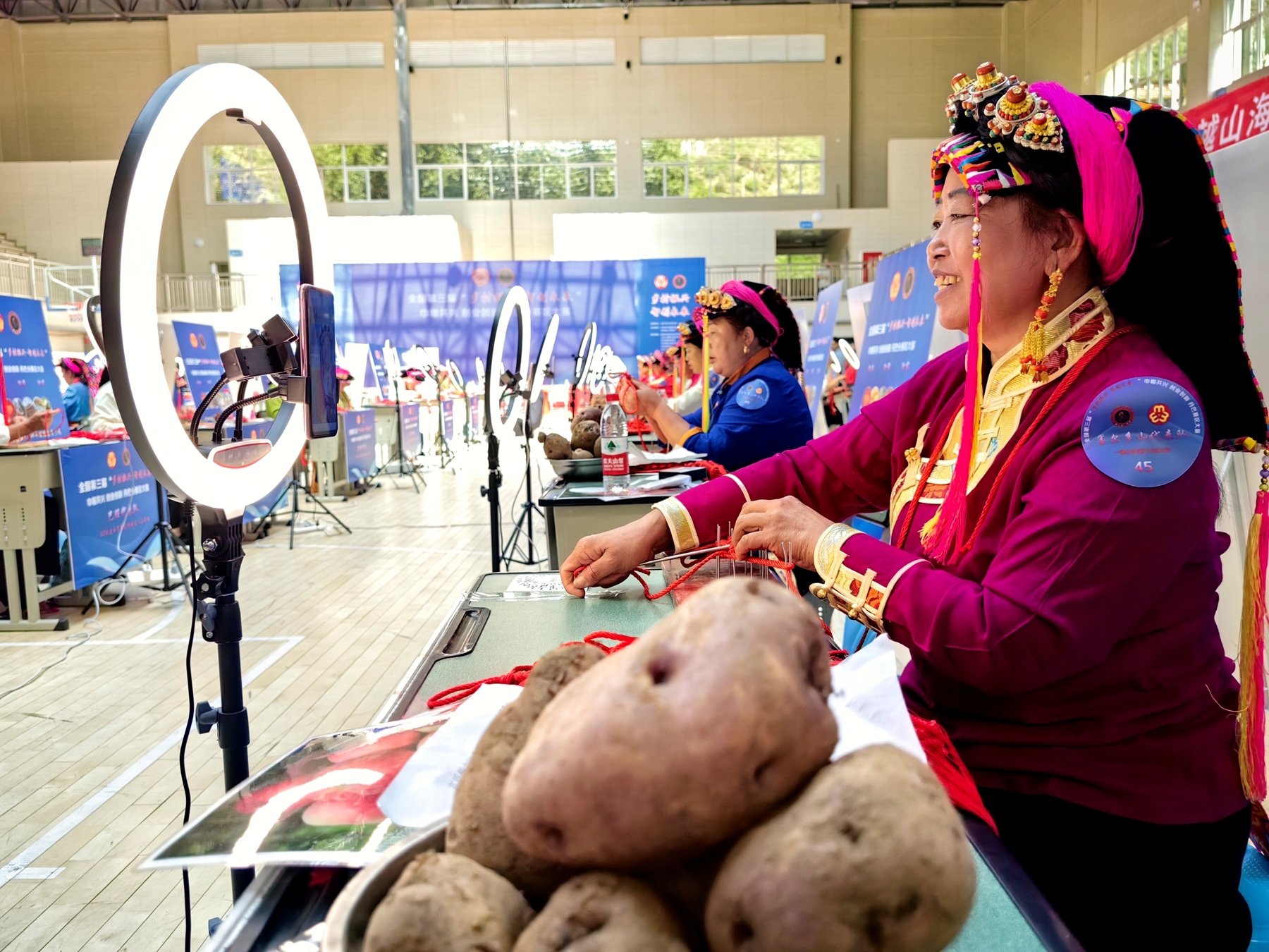 金华市妇联党组书记、主席严小俊远程参与开幕式,她说,中国结作为我国民间特有的传统手工编织饰品,由一根红绳从头到尾编织而成,它不仅是饰品,更沉淀着悠久的中华传统文化。编织中国结投资少、门槛低,是促进富余劳动力增收的有效途径。义乌“00后”大学生驻村导师们不惧高原反应,驻扎乡村1个月,通过“集中培训+入户教学”的方式,与每一位绣娘谈心,了解她们的需求,上门手把手教农户、绣娘们中国结编织技艺,一对一培训短视频拍摄、剪辑技术、直播讲解等技能;同时收集梳理丹巴县12个乡镇区域特色素材,开展旅游推介宣传、民族文化讲述、农特产品推广等“直播教学”,以培训送技术到乡镇,切实开展了助农、助旅、助业工作。金华市妇联还向大赛捐赠了100多个美颜灯和中国结编织具。