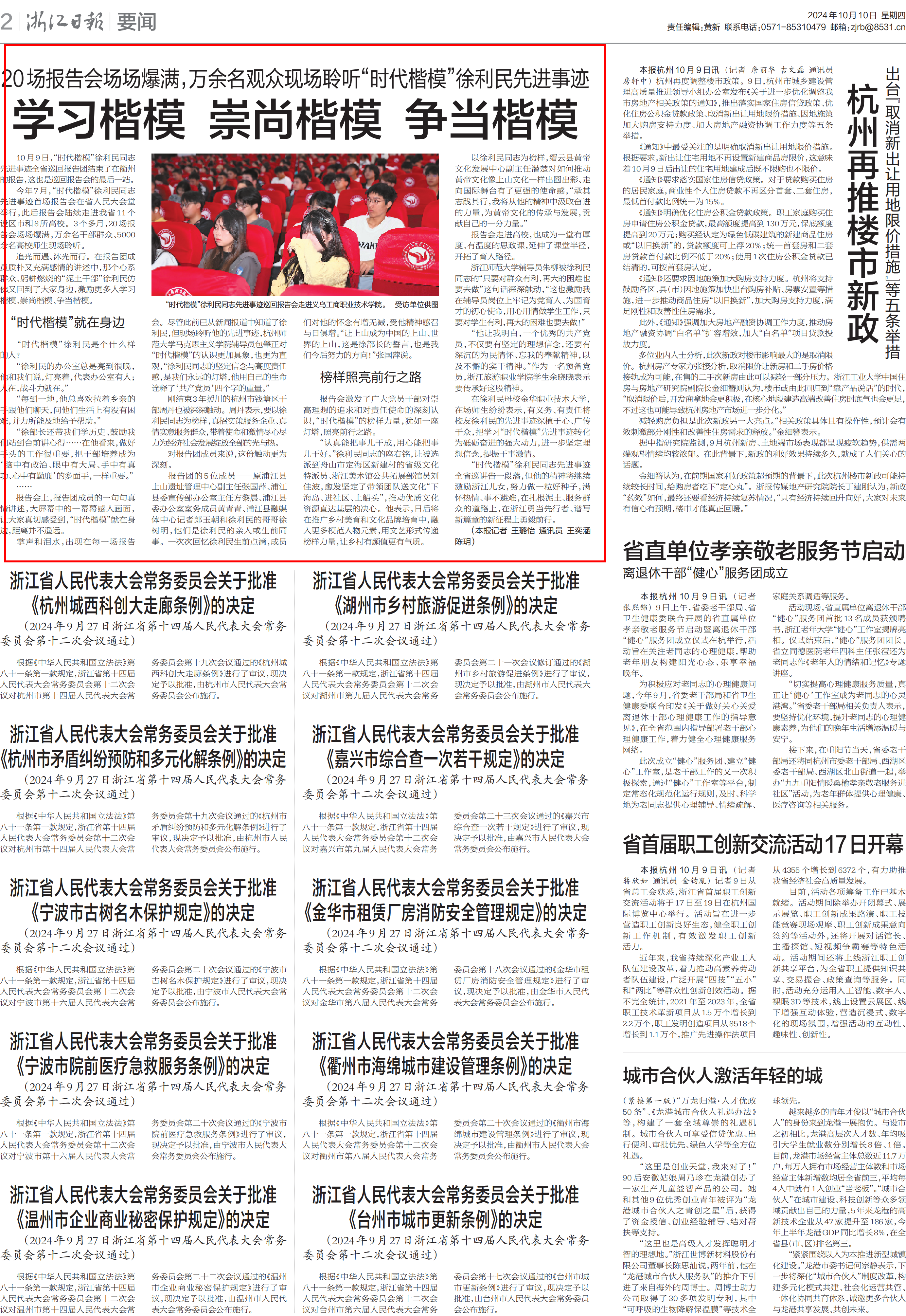 掌声和泪水,出现在每一场报告会。尽管此前已从新闻报道中知道了徐利民,但现场聆听他的先进事迹,杭州师范大学马克思主义学院辅导员包肇正对“时代楷模”的认识更加具象,也更为直观,“徐利民同志的坚定信念与高度责任感,是我们永远的灯塔,他用自己的生命诠释了‘共产党员’四个字的重量。”