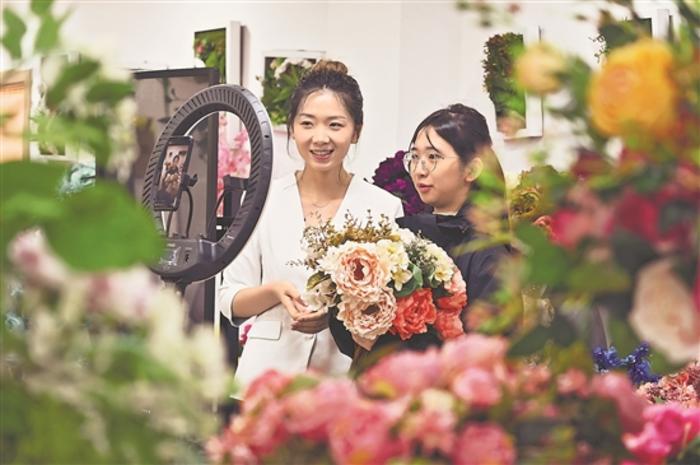11月20日,浙江义乌工商职业技术学院外语外贸学院多语种跨境直播中心,直播创业导师正在义乌市花类协会与学院共创的仿真花直播空间指导学生进行多语种跨境直播。与此同时,在饰品、工艺品等直播空间,创业导师们也正带领学生进行多语种跨境直播实践。