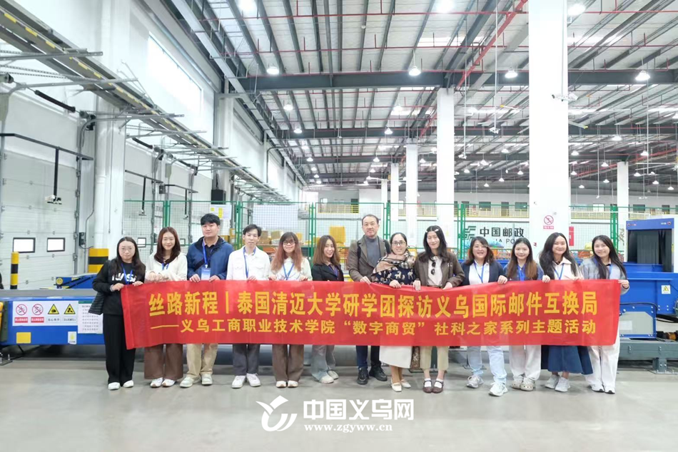 为深化“一带一路”教育合作与商贸文化交流,近日,义乌工商职业技术学院“数字商贸”社科之家成功主办了以“国际丝路文化交流”为主题的泰国清迈大学研学团参访活动。来自泰国清迈大学的师生代表团走进义乌国际邮件互换局,通过实地观摩与专业讲解,深入探索中国跨境物流与数字贸易的协同发展模式,开启了一场融通知识与实践的国际化学习之旅。