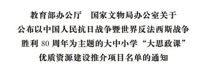 近日,教育部、国家文物局公布以中国人民抗日战争暨世界反法西斯战争胜利80周年为主题的大中小学“大思政课”优质资源建设推介项目名单,我省8个项目入选精品项目名单(100 项),数量居全国首位。