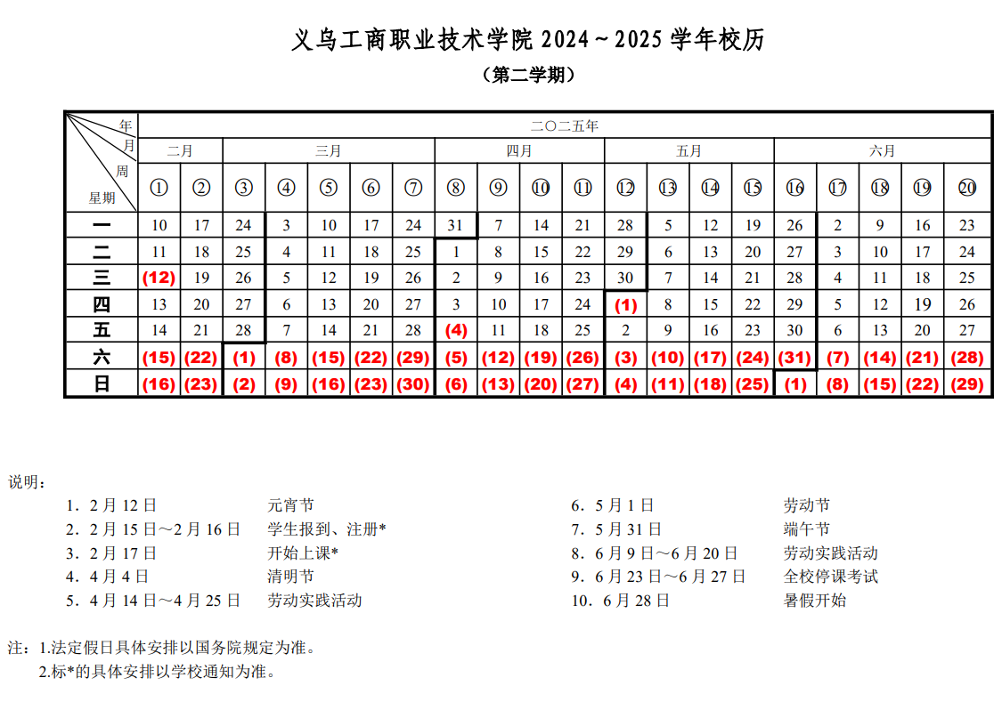 义乌工商职业技术学院2024~2025学年校历(第二学期)