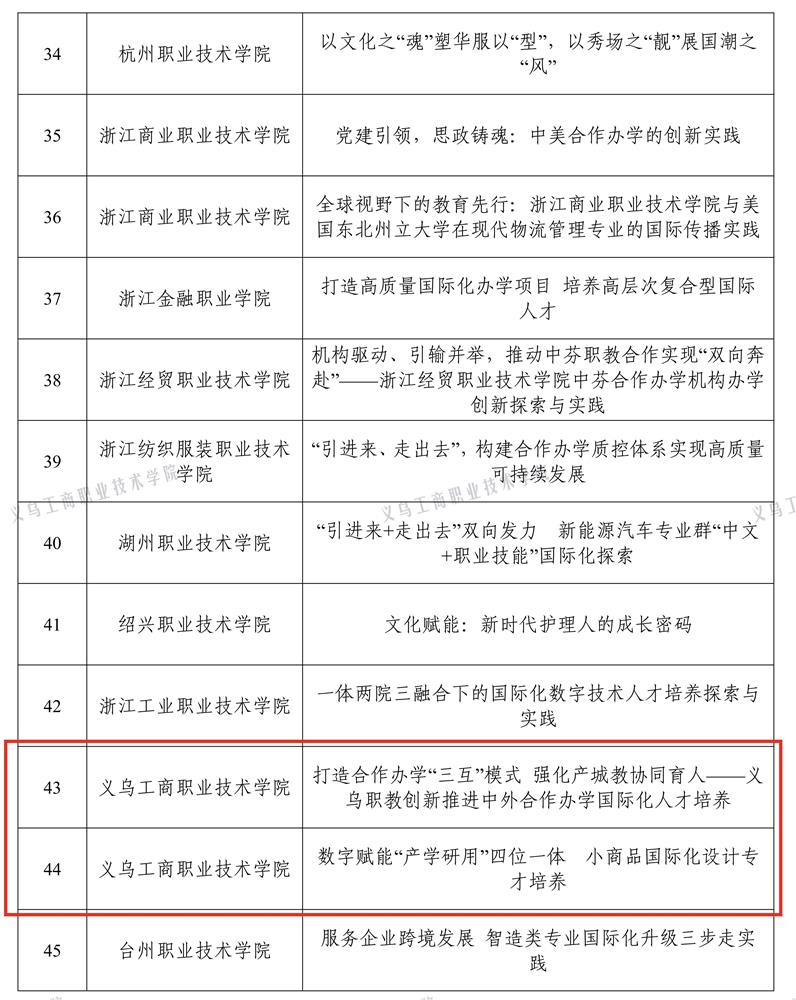 近日,省教育厅开展的中外合作办学优秀案例征集结果揭晓,uedbet,uedbet体育《打造合作办学“三互”模式 强化产城教协同育人——义乌职教创新推进中外合作办学国际化人才培养》及《数字赋能“产学研用”四位一体 小商品国际化设计专才培养》两个案例成功入选。